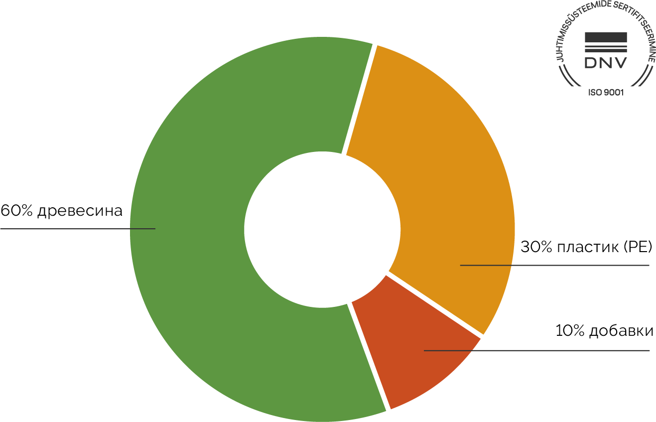 Долгосрочную прочность и высокое качество товара подтверждают пройденные испытания в Таллинском техническом университете в соответствии с международными стандартами Древесно-пластиковых композитных материалов при поддержке EAS.